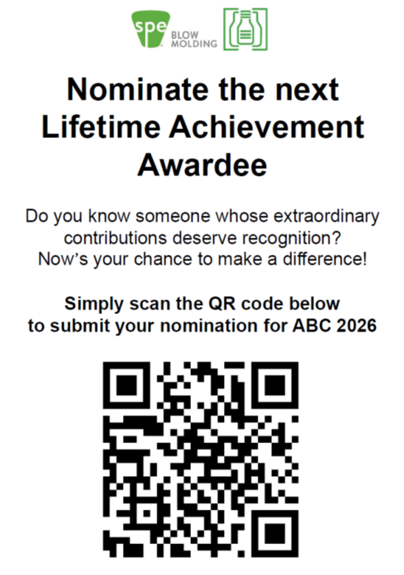 The awardee is selected by the Blow Molding Division's Board of Directors from nominees sponsored by the members of the Society of Plastics Engineers and include a consideration of the candidate’s professional record inside and outside of the industry and the continuing effects the candidate’s work has had in the industry. The awardee is presented with an engraved plaque during the Awards Program and Reception at the Annual Blow Molding Conference and a donation in their name is made to the Division’s Grant Fund.